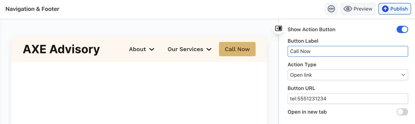 You can enable a call to action by checking the “Show Action Button” option. This allows you to place a CTA at the top of every page on your site.