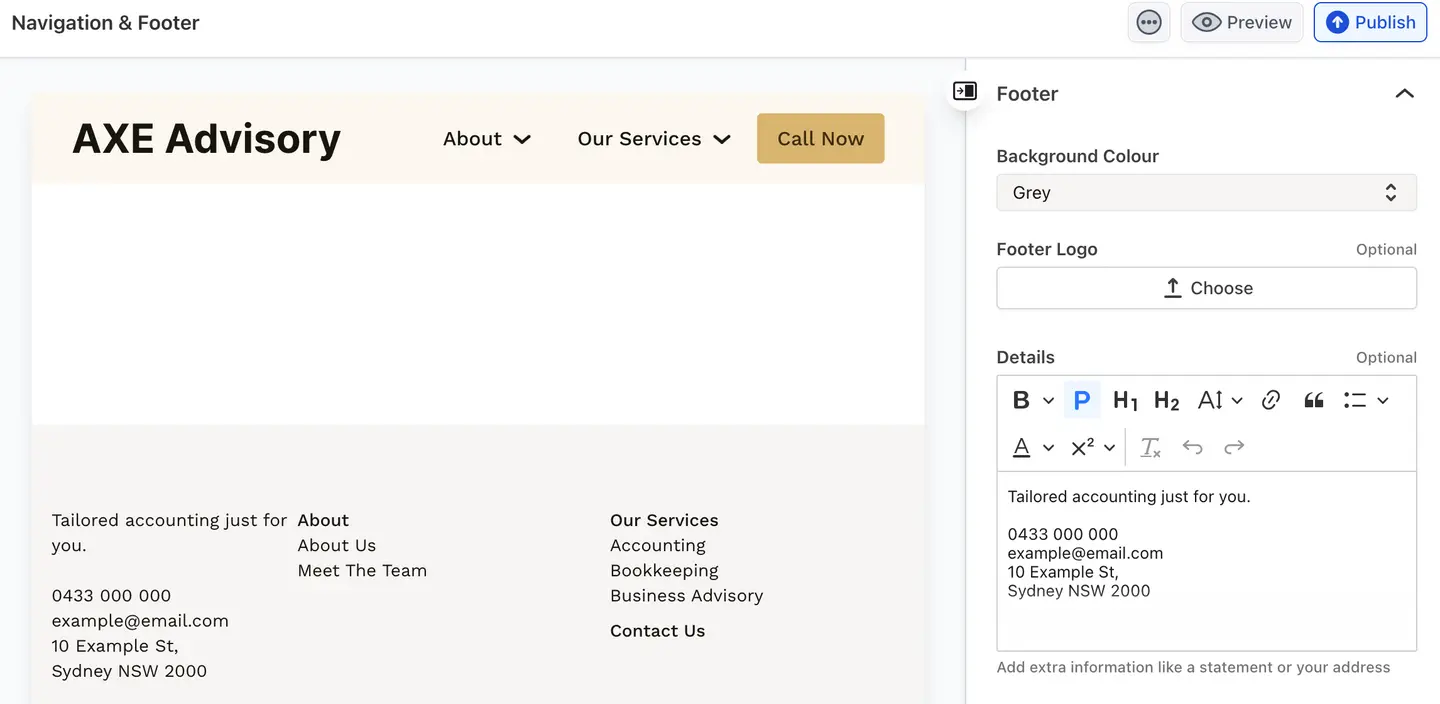 The first setting is the background colour. You can then upload another variation of your logo, in the footer there is more room than the header so logos with taglines or taller layouts can be used.