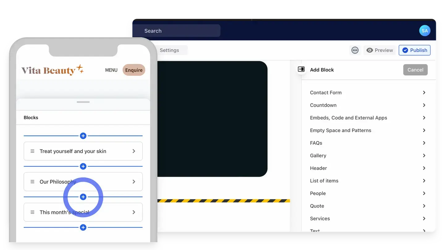 Hovering over or tapping a Block will reveal the Edit button. Press the button to open the editor where you can add your content and customise the look and feel of the Block.