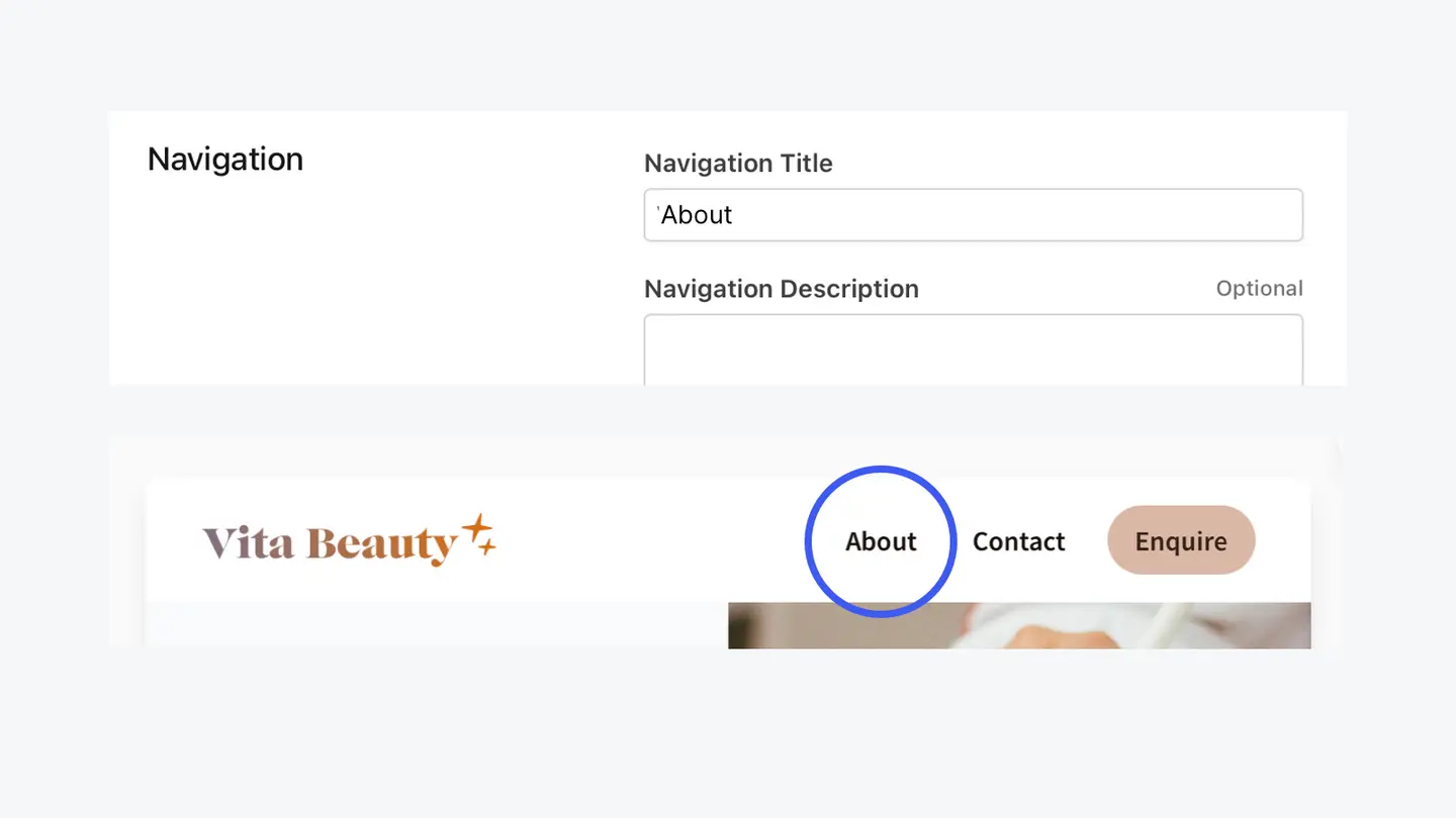 For example you might give a page a title (see above) of ‘About My Company’, setting a seperate navigation title lets you show that page on your website with a link titled ‘About’