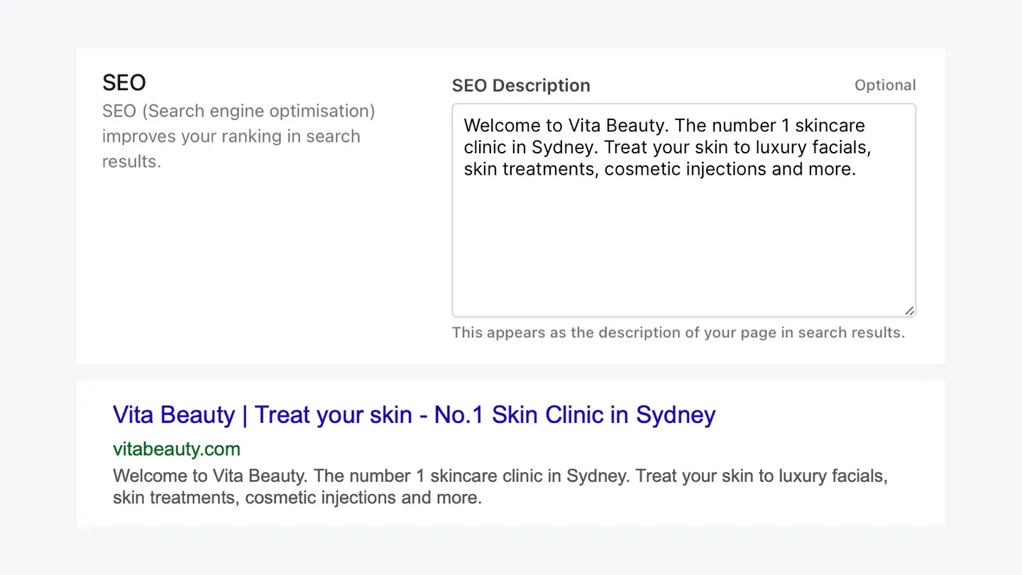 Vert will automatically provide a description of your page to search engines. If you need more control over the description you can adjust the page's meta description under the SEO section in page settings.
